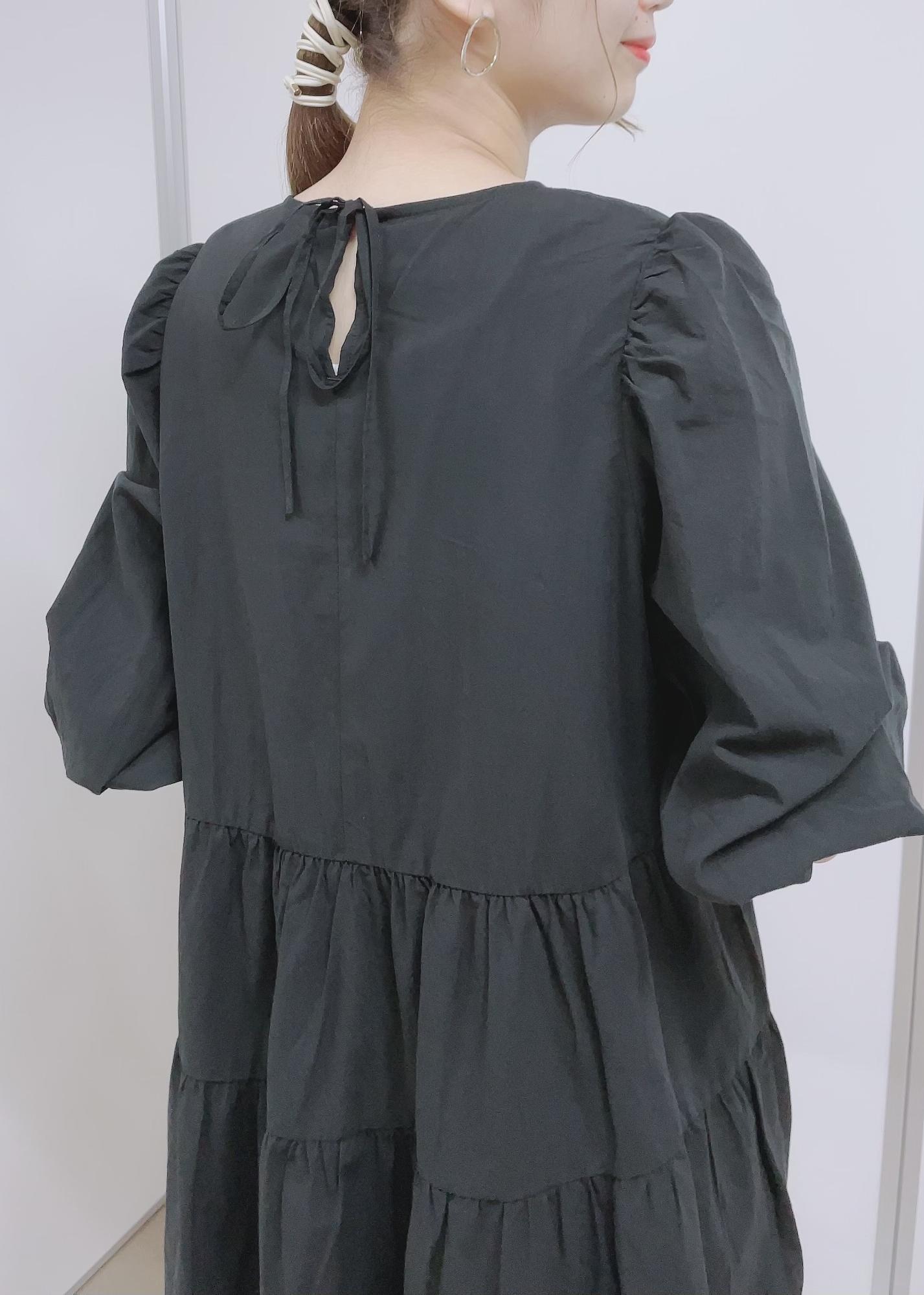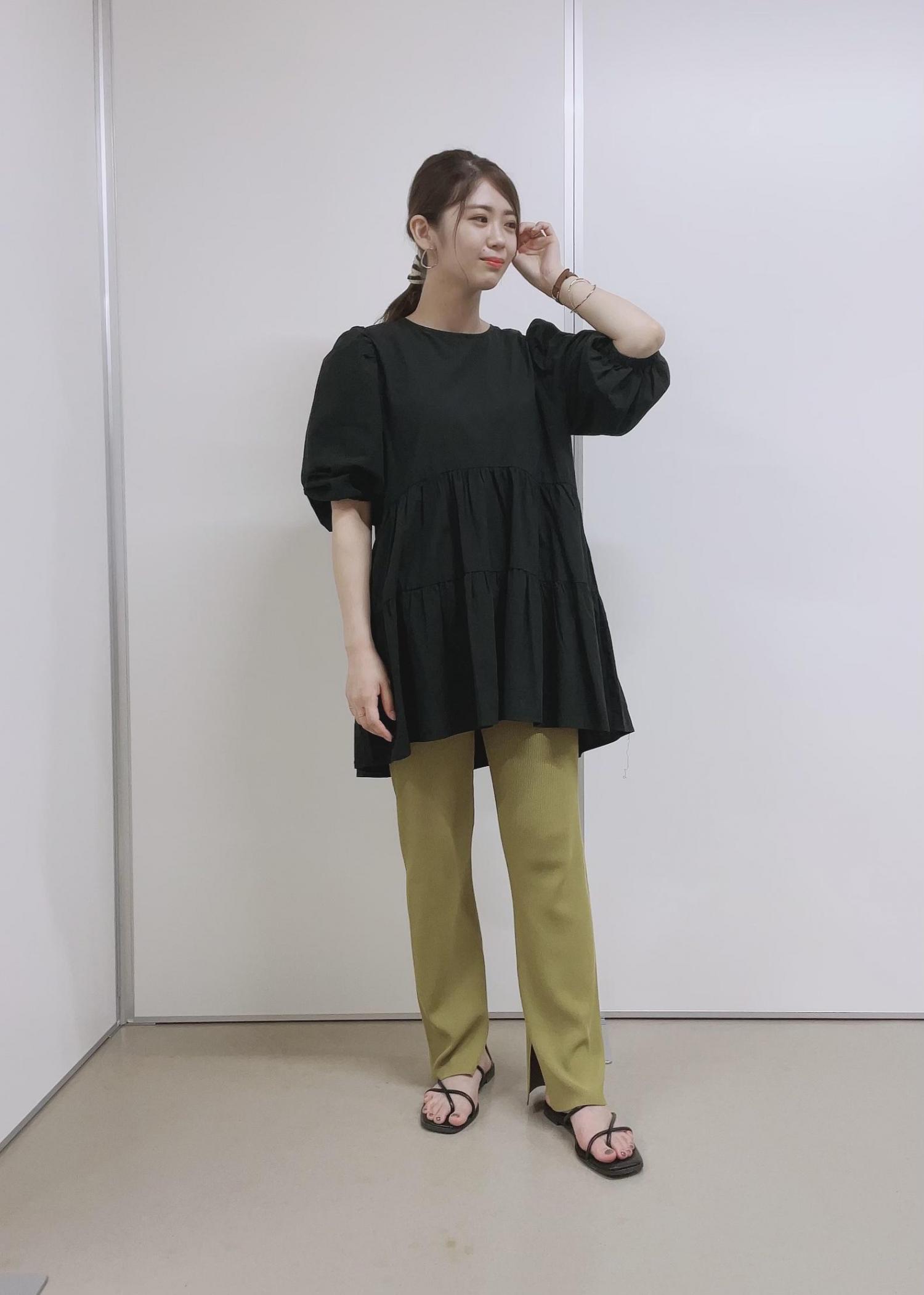 トレンド感のあるティアードブラウスと、リブニットパンツを合わせた楽ちんスタイルです。