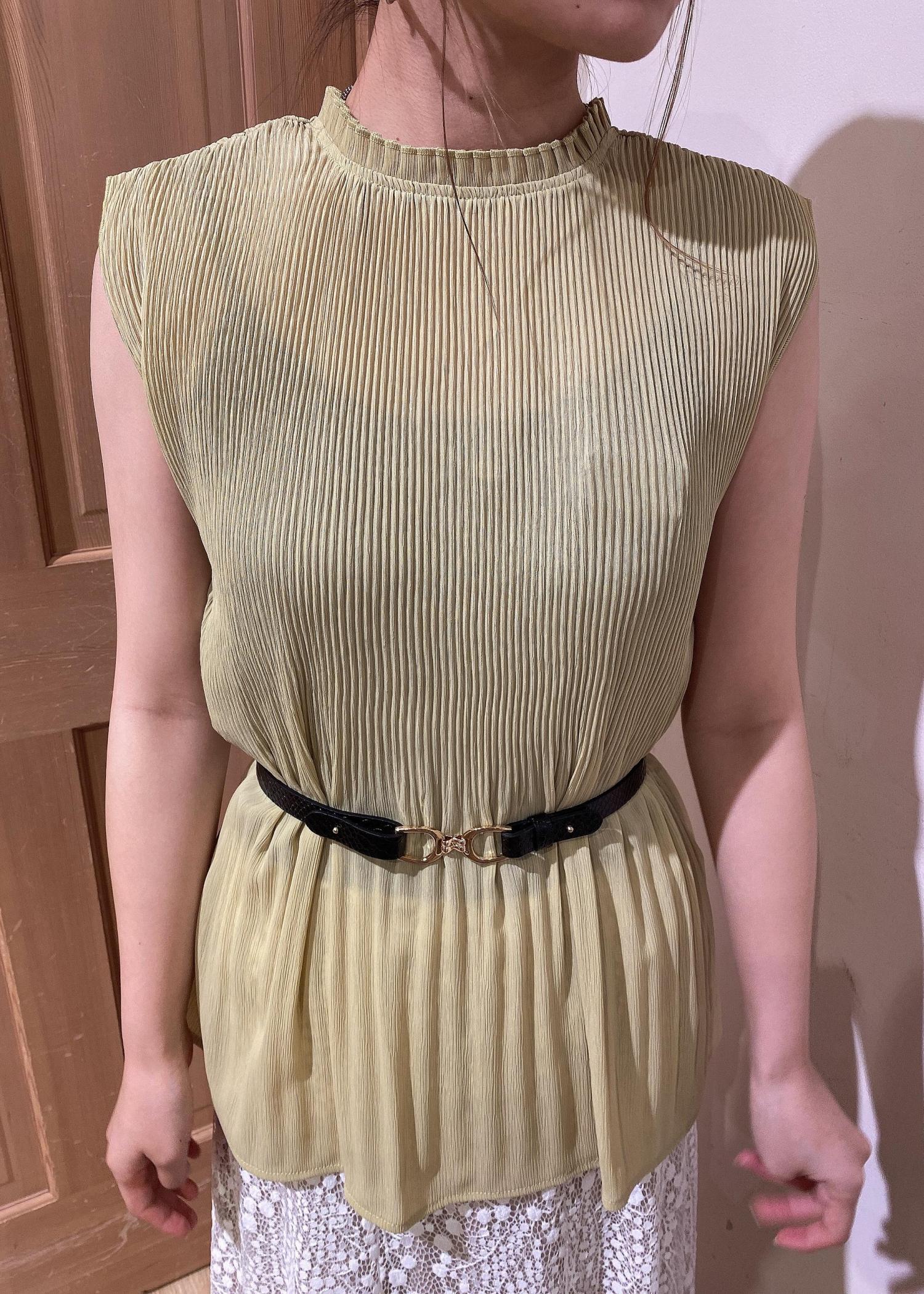 鮮やかなイエローのトップスにレースのスカートを合わせ、フェミニンスタイルにしました。