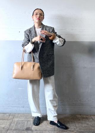 スタイリングのアクセントにもなる質の良いバッグは肩がけをしても程よい厚みで持ちやすく、サマになるバッグです。