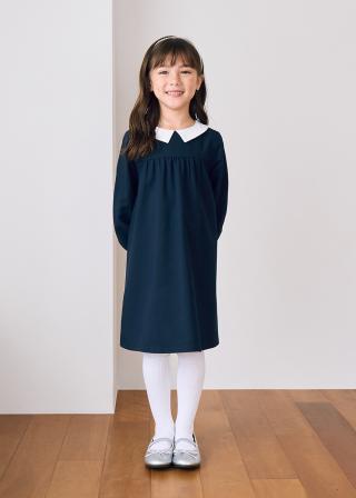 ・きちんと感のある襟付きデザインの長袖ワンピース。