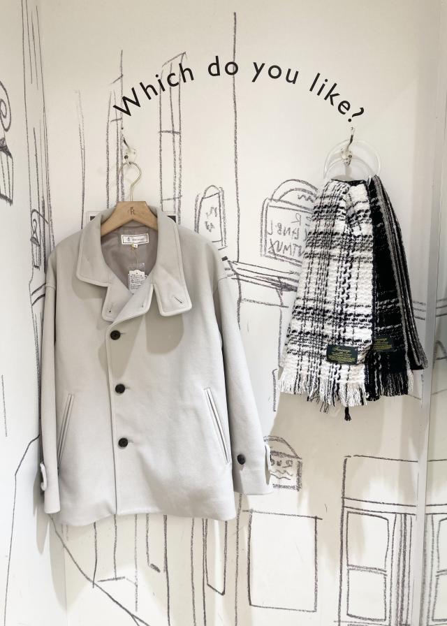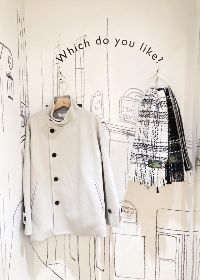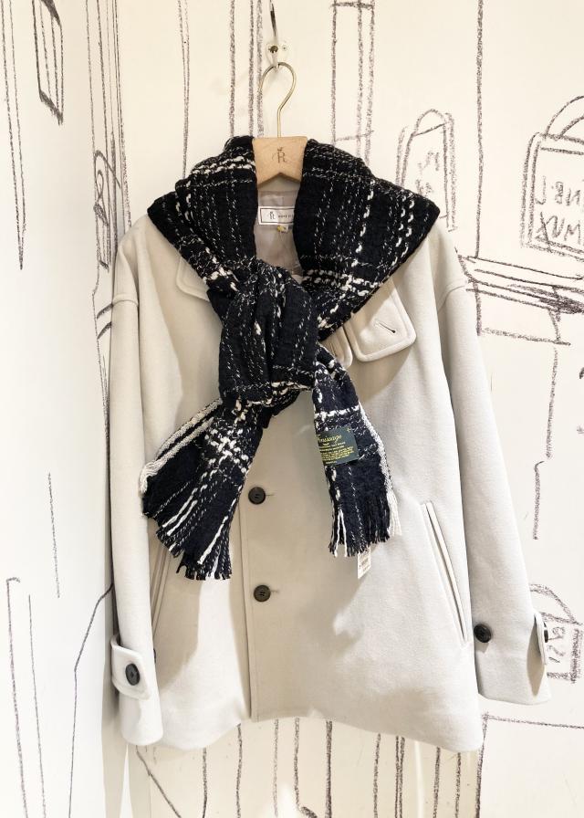 コーディネートを選ばない、2wayデザインのショート丈アウターです。 スタンドカラーにもオープンカラーにもなる仕様で、インナーやストール合わせでもすっきりお召し頂けます。 首元のポイントに、モノトーンのストールを合わせて品良く合わせてみました。