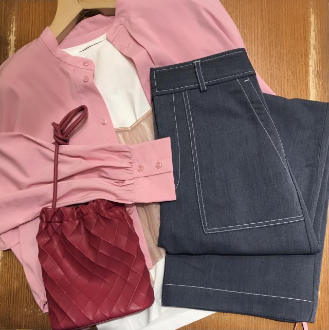 パンツはブルーを合わせることで、ピンクの色味を引き立たせてくれます!