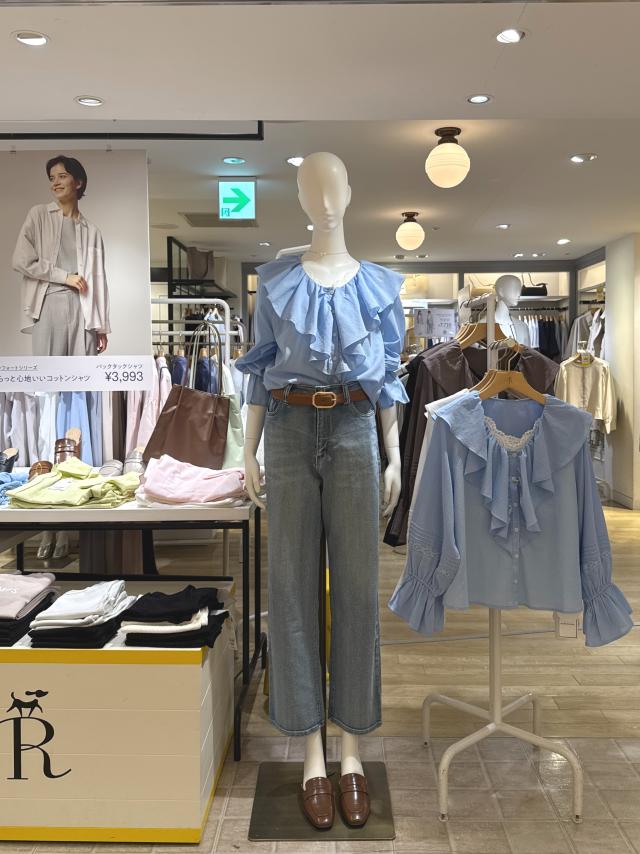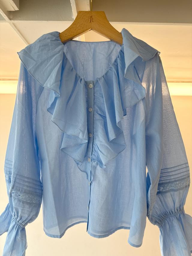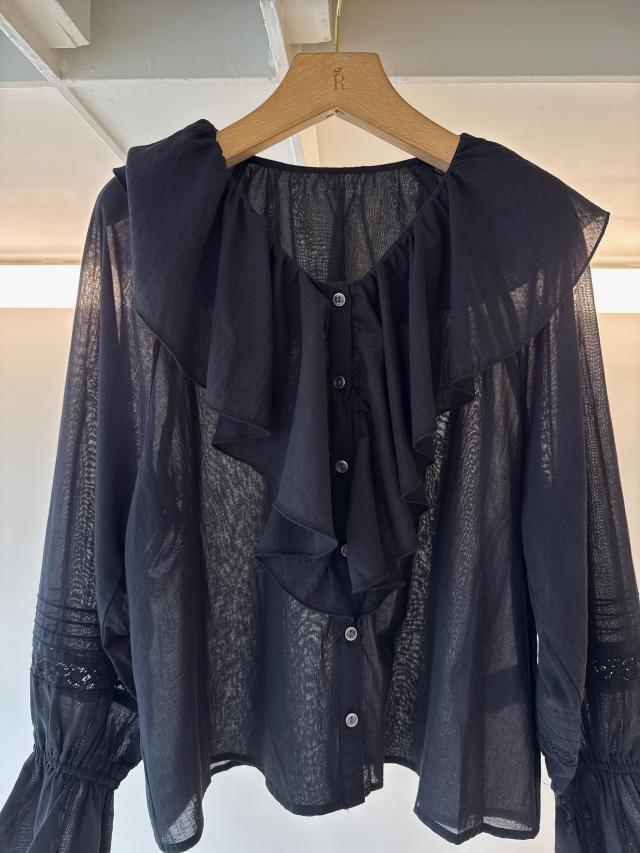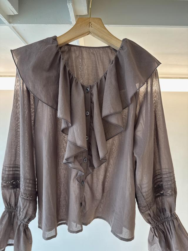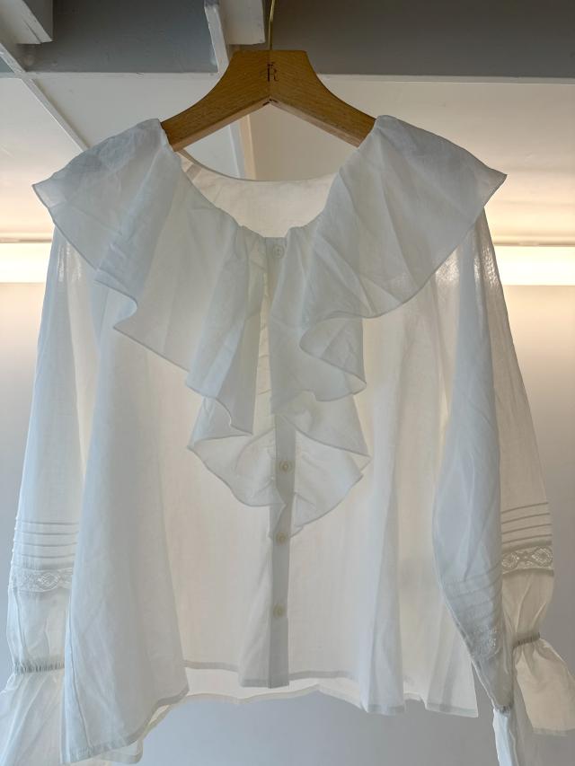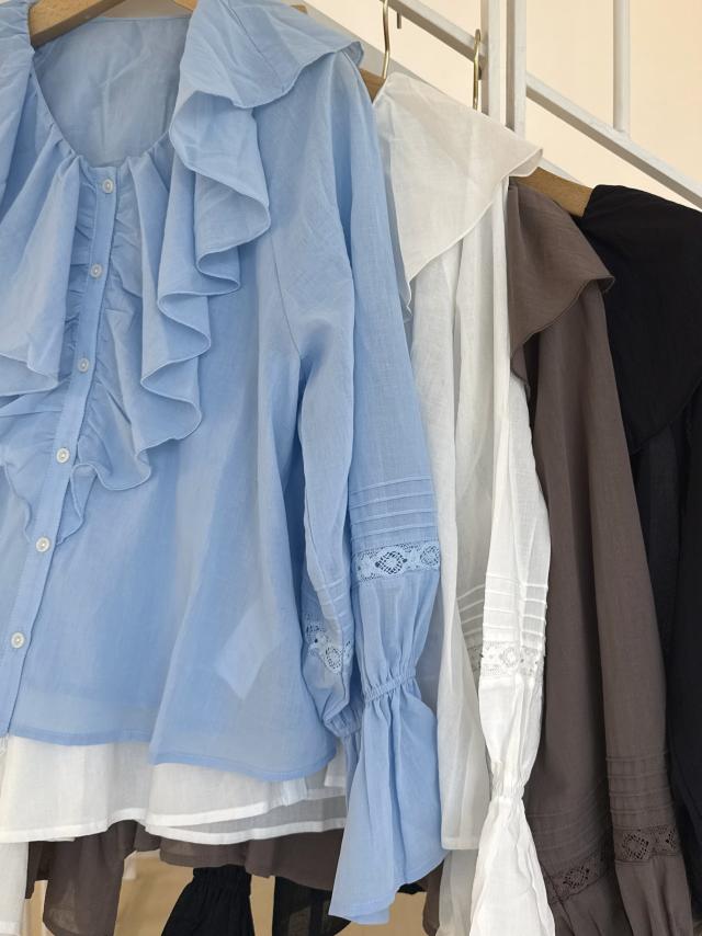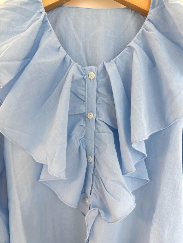 通気性のいい綿ボイル素材で夏場の汗や湿気などを吸水してくれます!前見頃にあるラッフルカラーが特徴で、とても可愛らしい印象のアイテム!