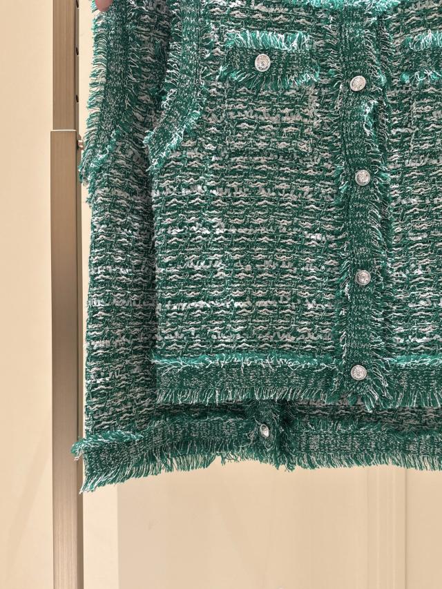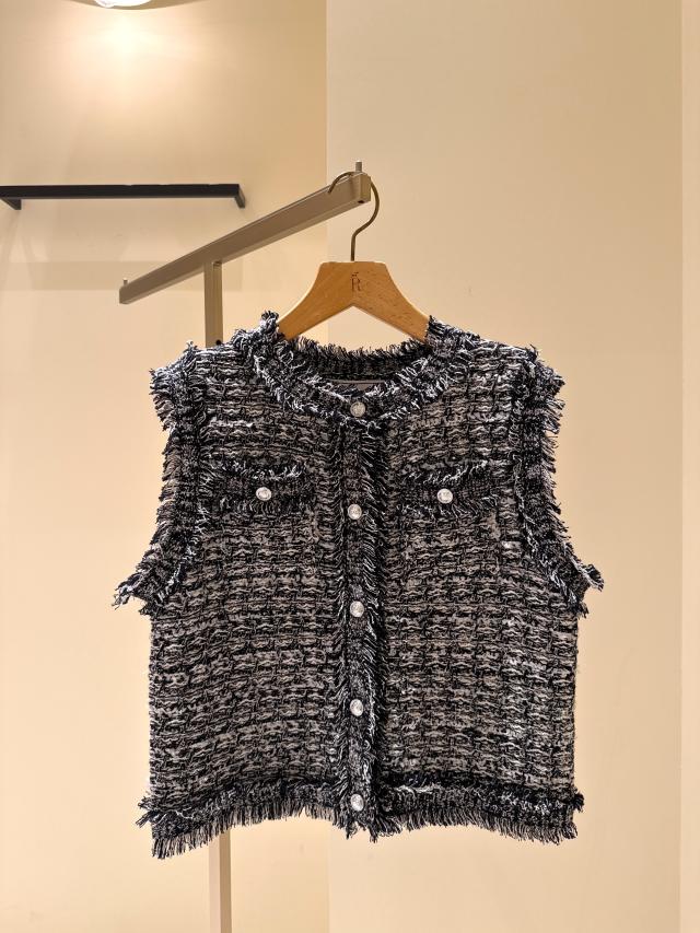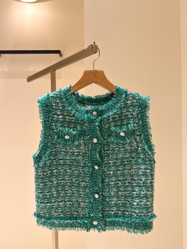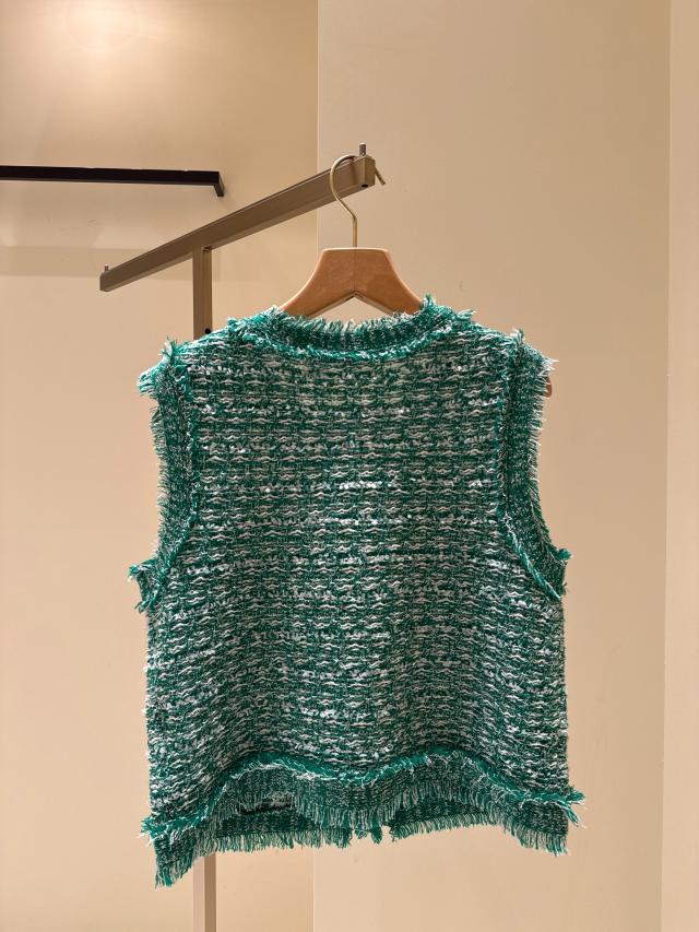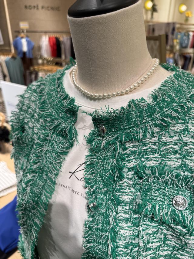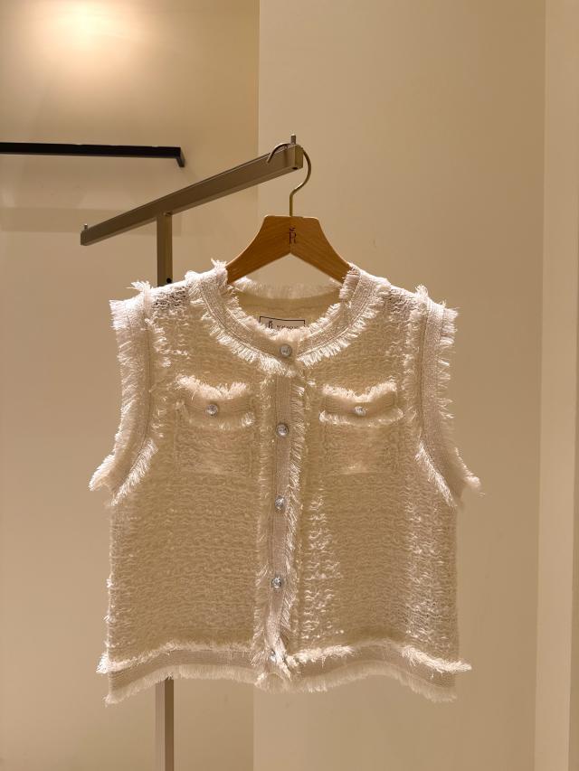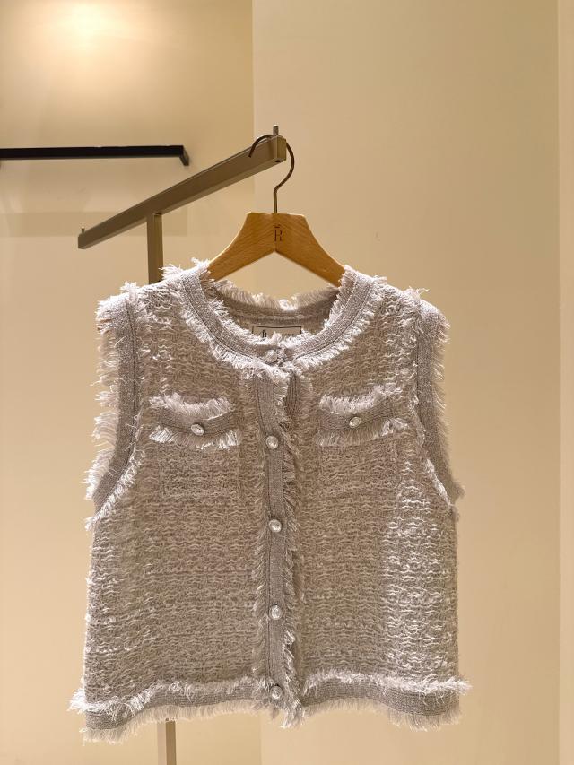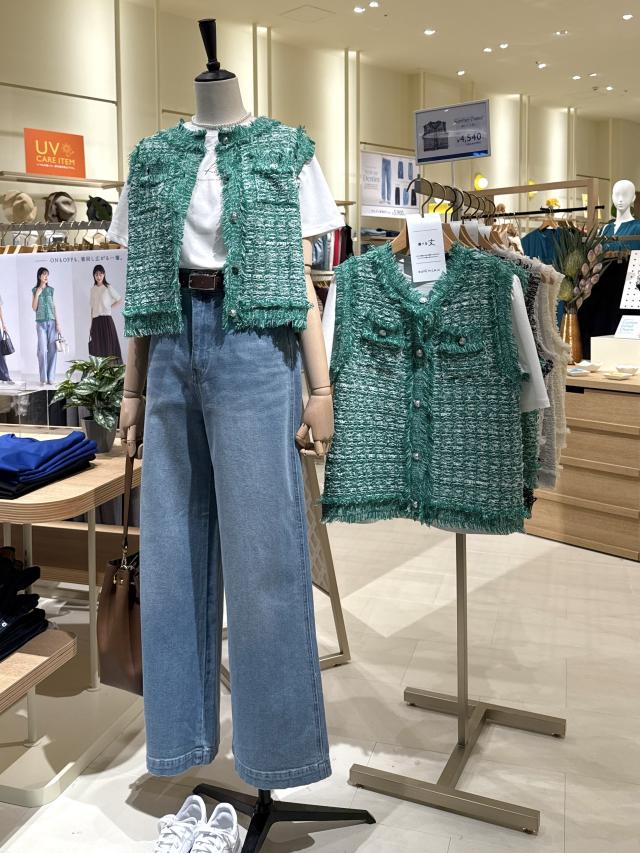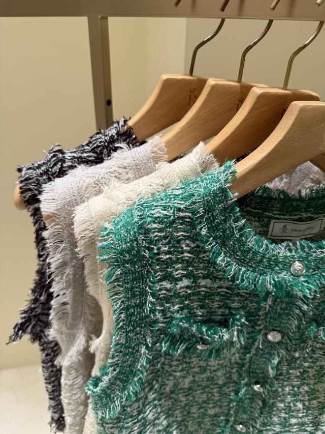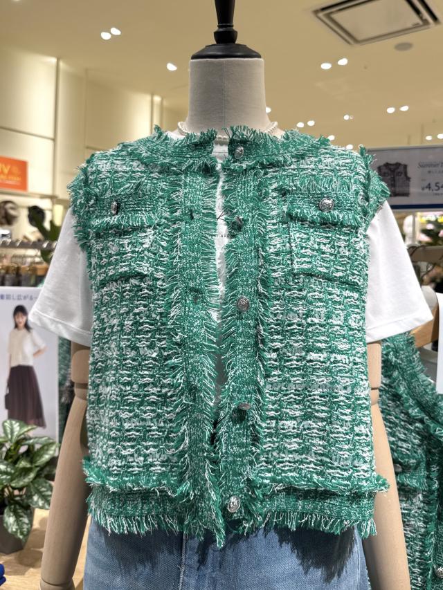 自分好みのサイズと人気の着丈が選べるシリーズで、38サイズは38Tサイズより着丈が7cm短くなっています。ストレート糸、リング糸、リボン糸を組み合わせた表情豊かなニットで、ファンシーツイードのようなスリーブレスデザインが特徴!