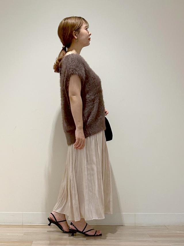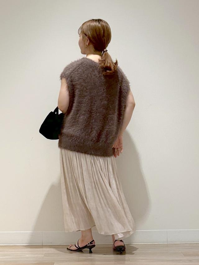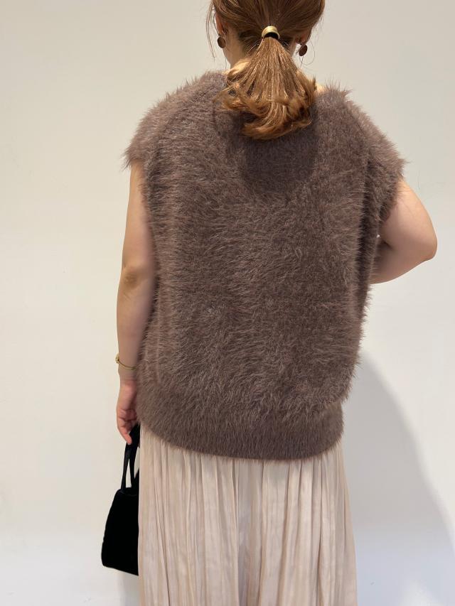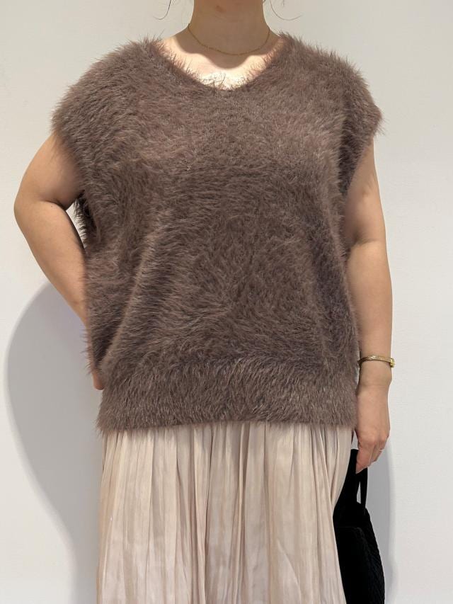 ブラウンのシャギーニットベストは、コーディネートに取り入れるだけで一気に秋気分になれるアイテムです。