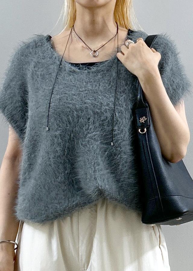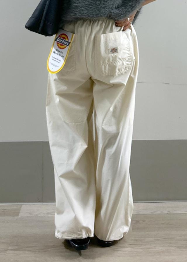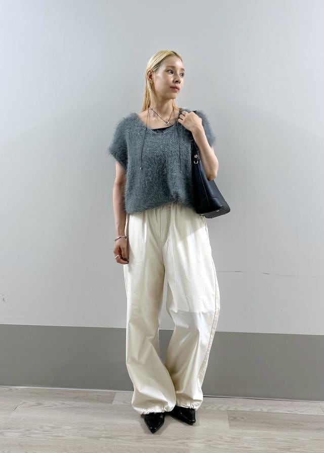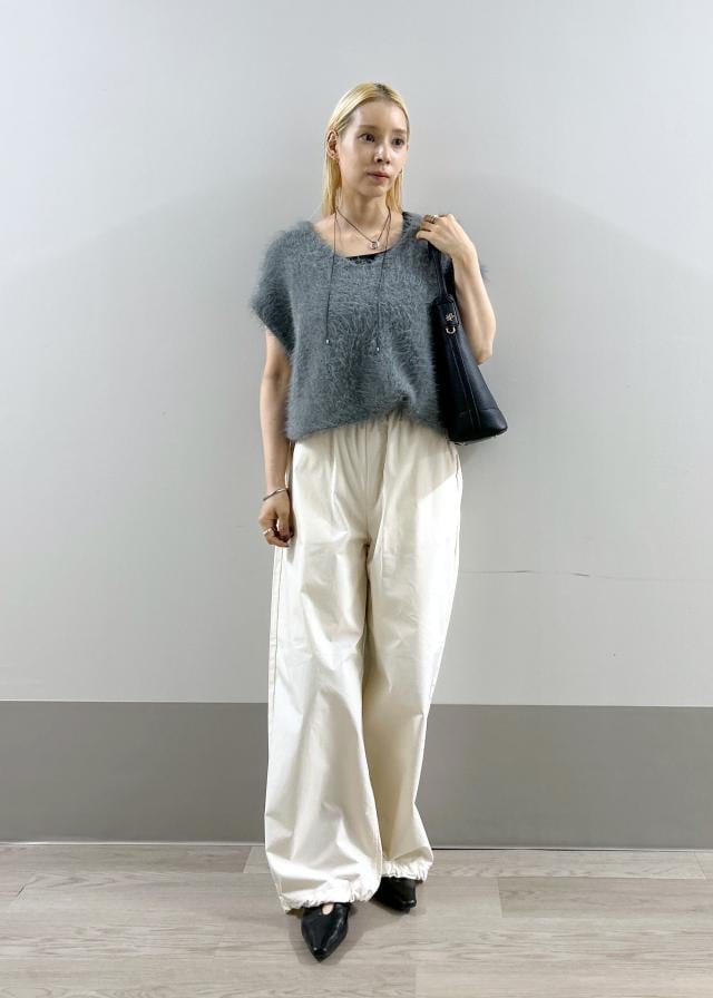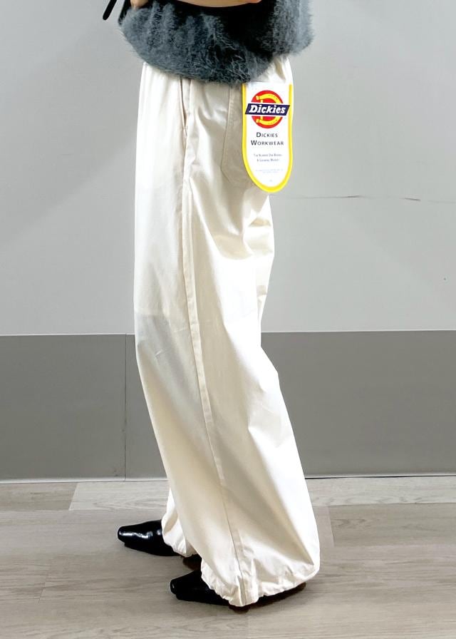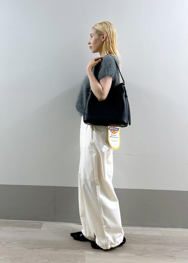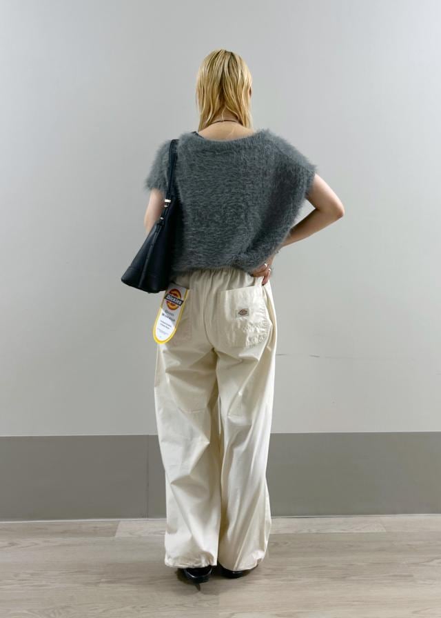 カジュアルデザインの【Dickies】を毛足の長いシャギーニットトップスと合わせて大人見えに合わせたスタイリングです。