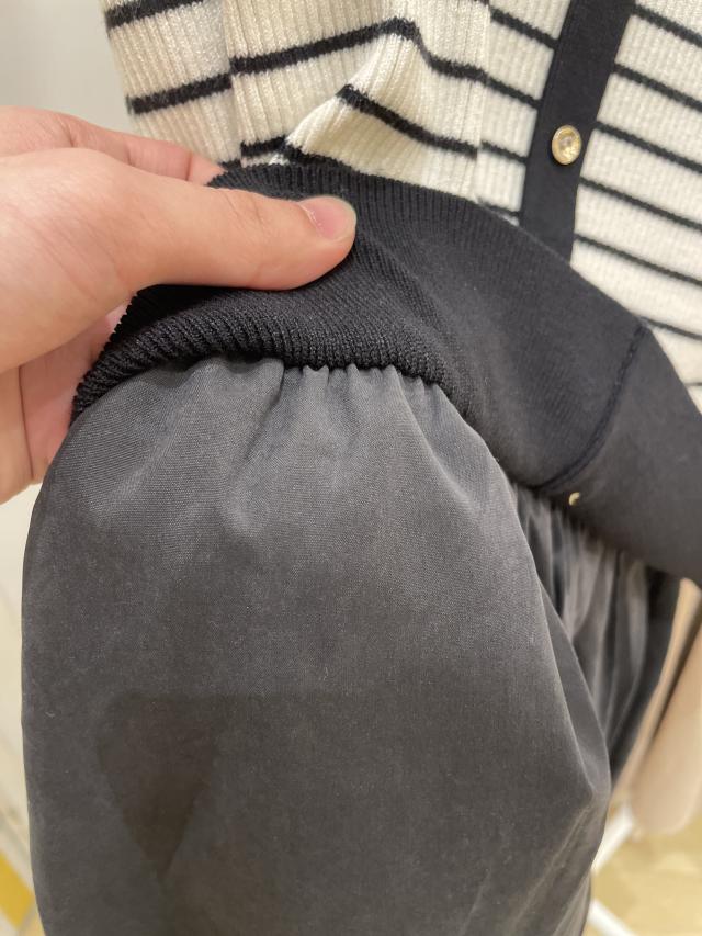上半身がタイトな分、布帛のスカートはギャザーが入っていて、ふんわり広がりようなシルエットです。