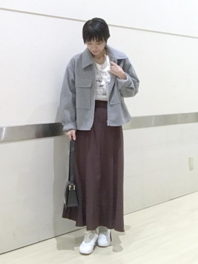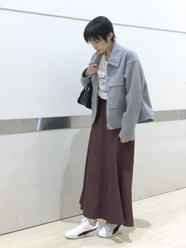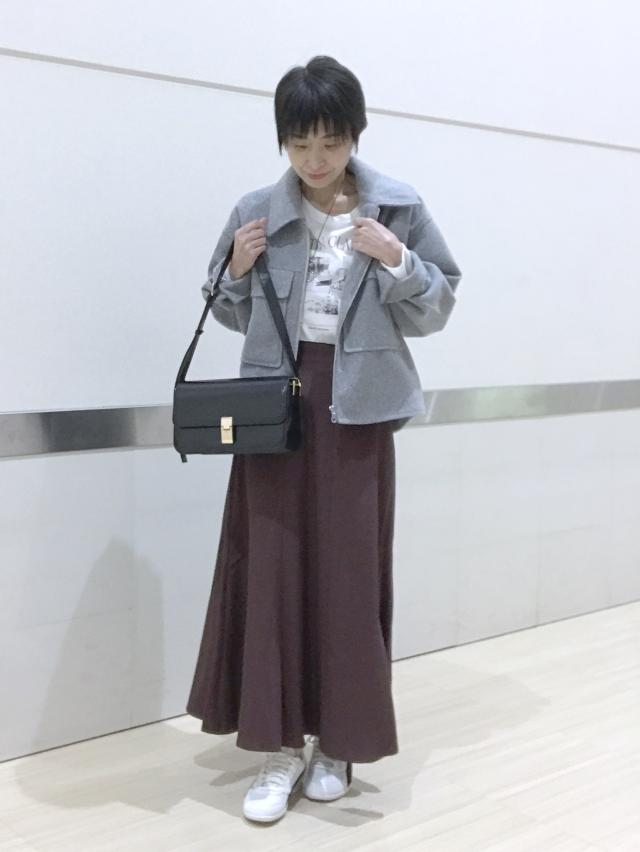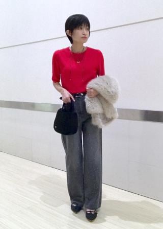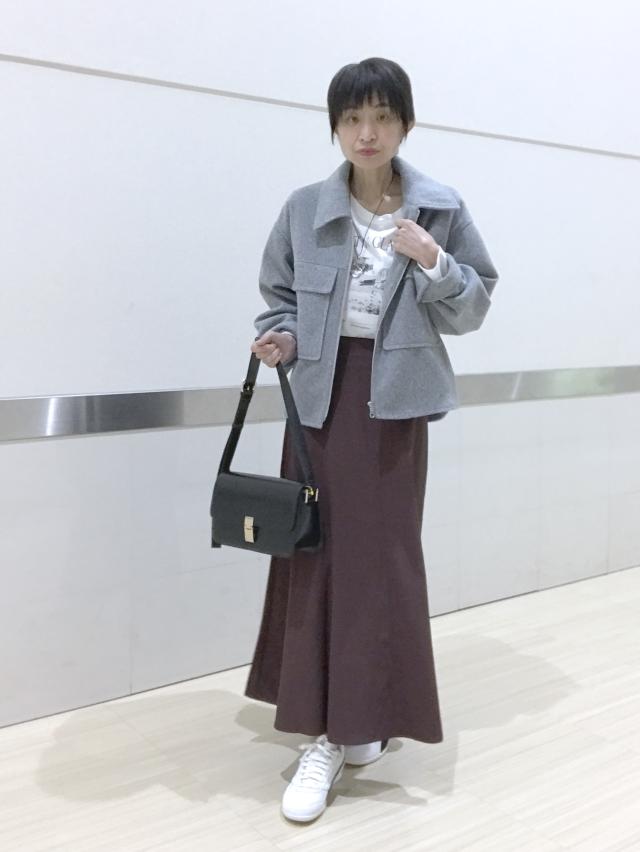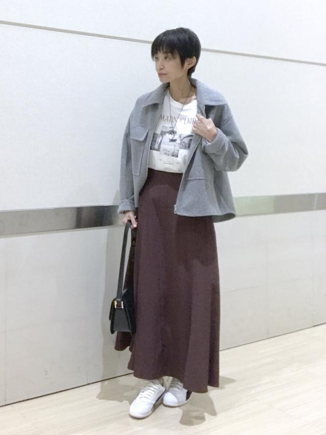 トップスは落ち着いた色味でボトムスに差し色でワインの色味で明るさを出しました◎