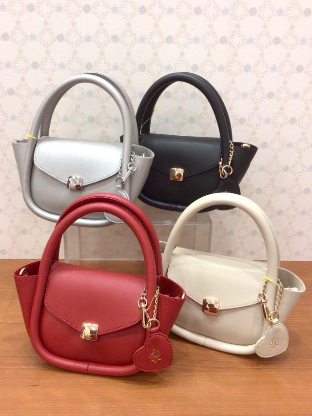 ベーシックカラーのブラックとキナリ、アクセントカラーになるレッドとシルバーの4色展開です。ハートチャームが付いててコロンとしていて可愛いミニバッグです!