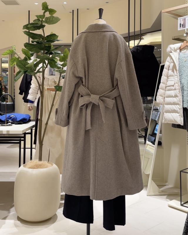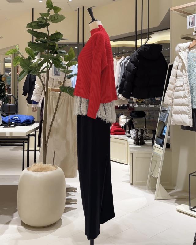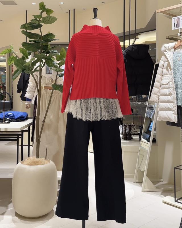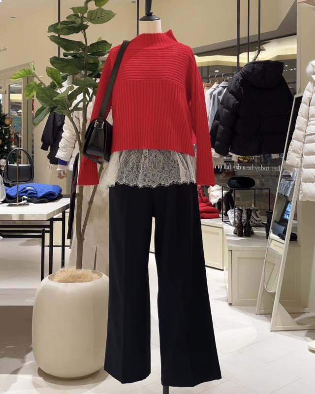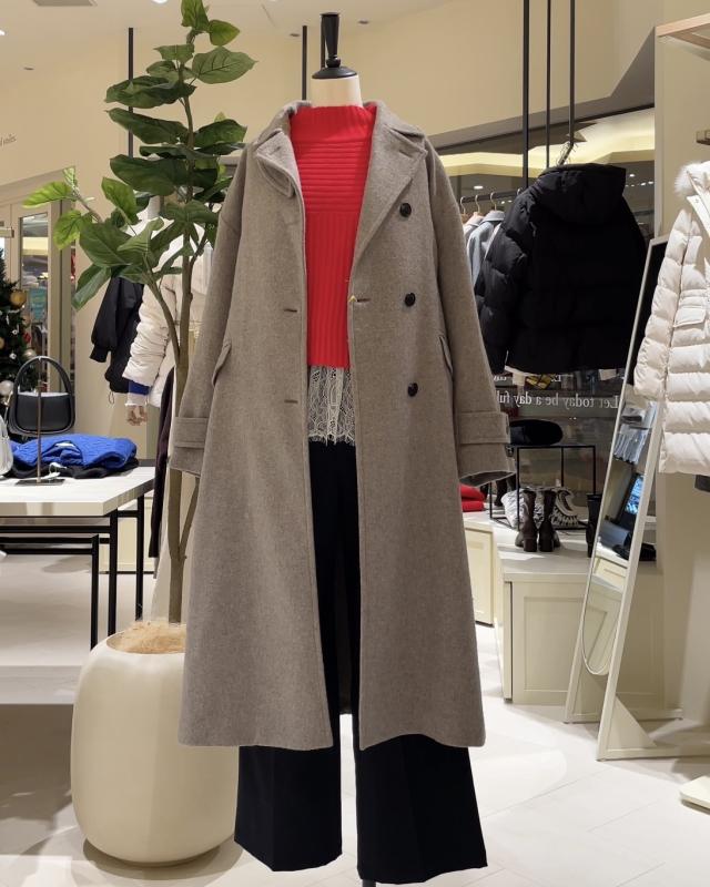 パンツはネイビーを取り入れ、赤を目立たせすぎないようにし、コートの明るいベージュで全体のバランスを整えました。