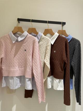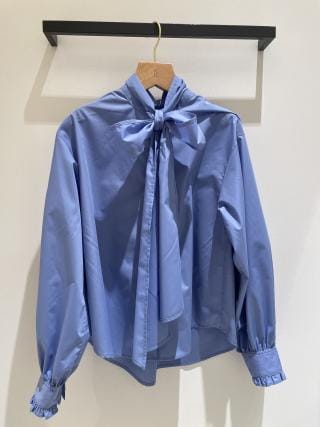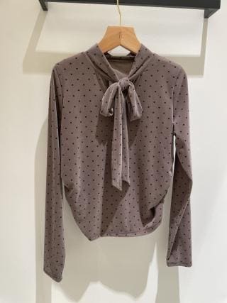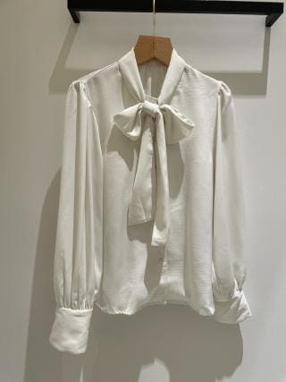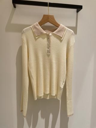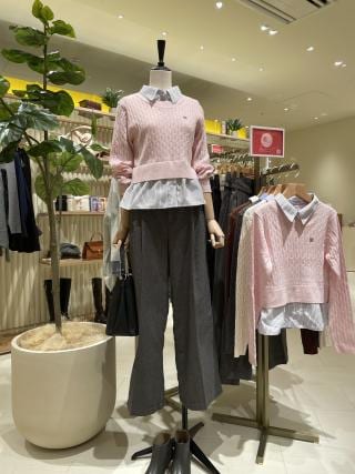vネックを活かして襟付きシャツやボウタイシャツなどを重ね着した組み合わせがおすすめです。