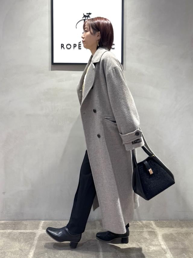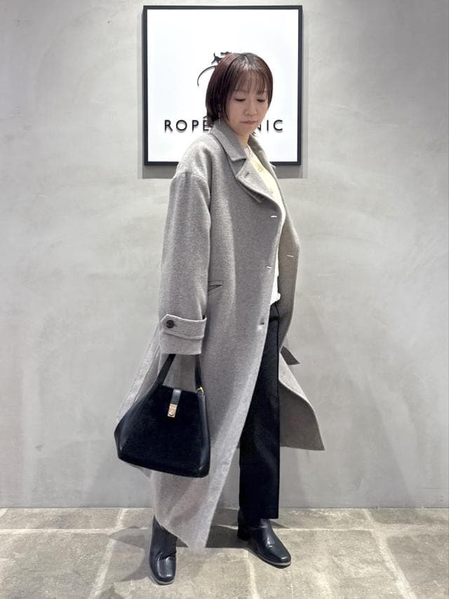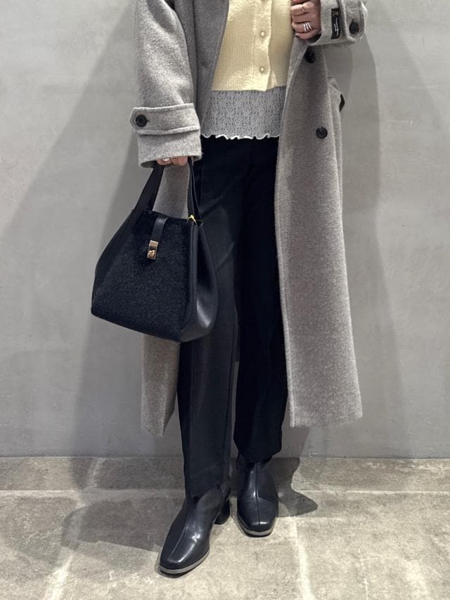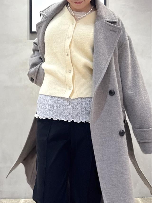 淡いイエローのニットに、落ち着いたグレーのロングコートを合わせてやわらかく女性らしい印象に。