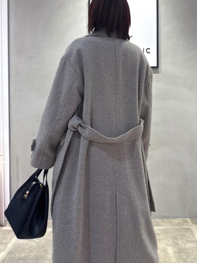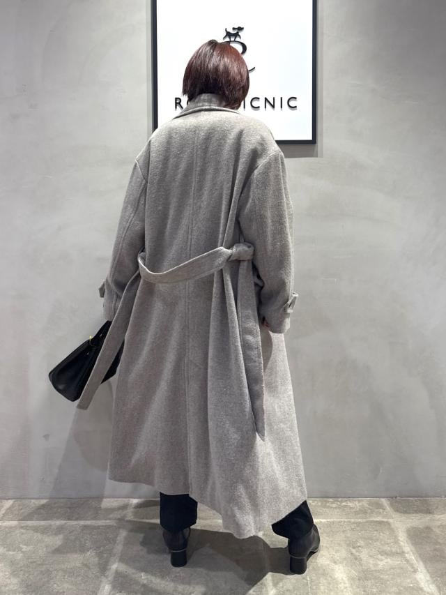 ベルテッドタイプのシンプルなロングコート。