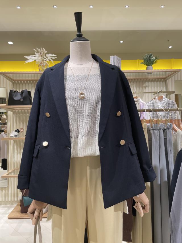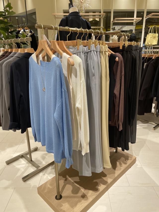 鎖骨がキレイに見えるスクエアネックデザインです。カーディガンやメッシュニット、ジャケット、