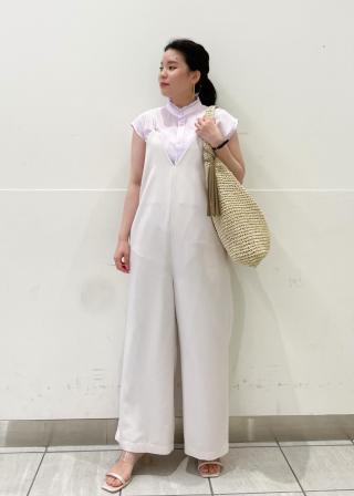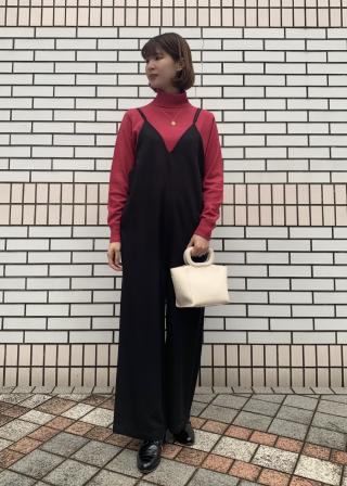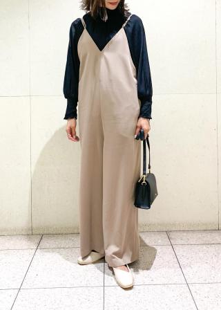 サイズ感:着丈は肩紐後ろで調節ができますが、もともと少し着丈長めな印象です。ワイドシルエットなのでゆったりと着れます。キャミソール型なので身幅ゆったり目のトップスやボリュームスリーブのトップスなどもインナーに着れそうです。