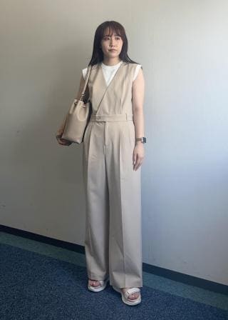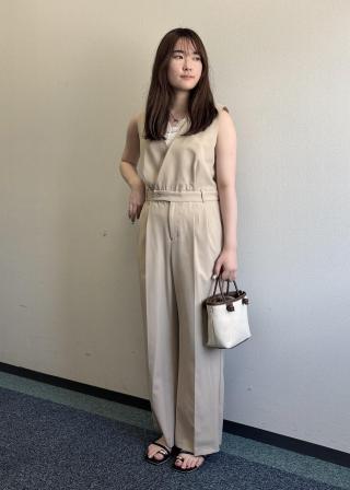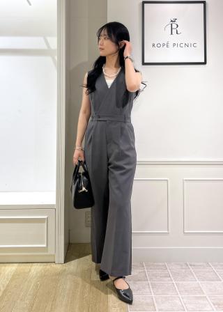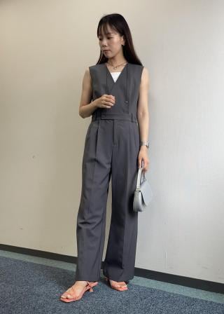・ベルトラインの切り替え入りで、セパレート風デザインのスリーブレスオールインワン。