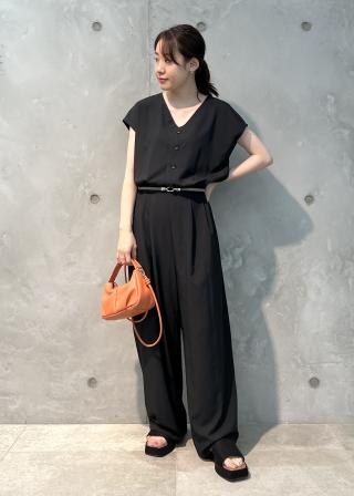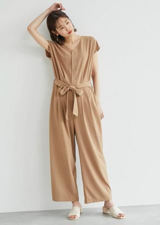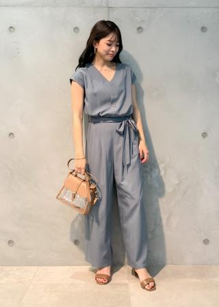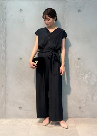 ・女性らしくエレガントに着られる、Vネックデザインのジャンプスーツ。