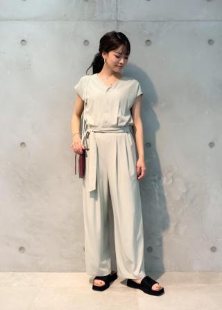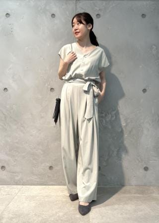 ・ウエスト切り替えでメリハリを出し、パンツラインはワイドにして大人っぽさをプラス。