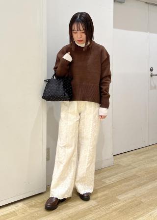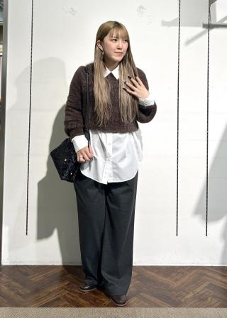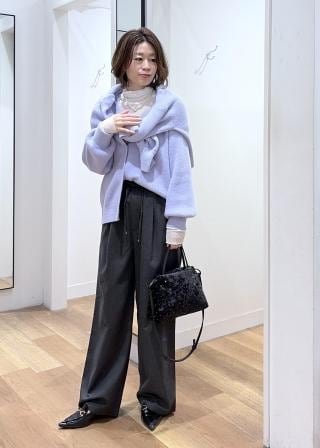 ・ウールのコートやツイードジャケットなどマットな素材のアウターと合わせることで、シャイニーベロアの質感がより一層引き立ち、季節感のあるコーディネートが完成。