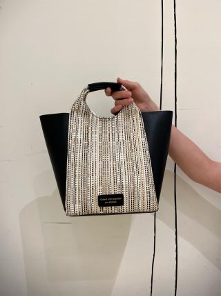 ・フロントとサイドを異素材で切り替えた、コンビデザインのくり手トートバッグ。