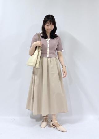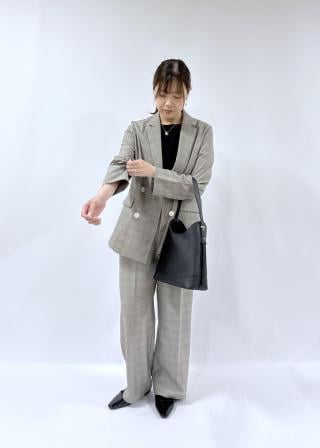 ・バッグのレザー見え素材がきれいめな印象を与えるので、オフィスカジュアル/通勤やセレモニースタイルに。
