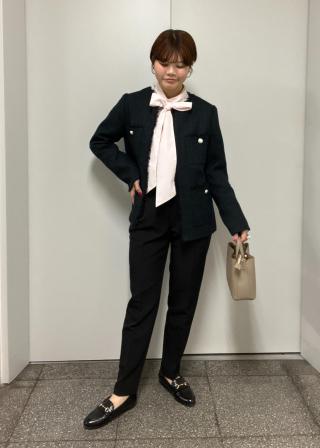 グリーンが黒系のコーディネートに映えて、とても可愛いです。