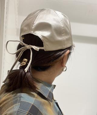 ・艶やかなサテン素材を使い、モードな雰囲気に仕上げた6パネルキャップ。