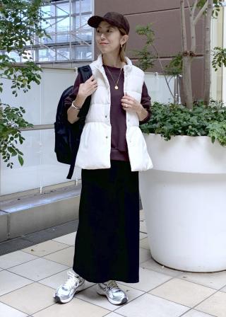 ・きれいめな装いにも合わせやすい上品なダウンベストは通勤にも活躍。