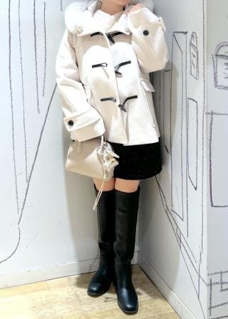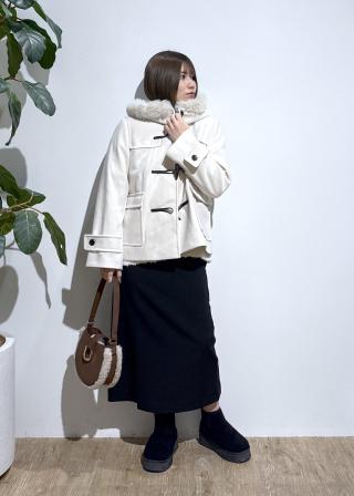 ・フードにたっぷりとファーを飾った、ショート丈のダッフルコート。