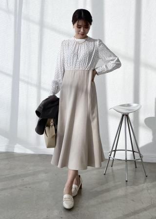 ・丸襟ブラウスや、スタンドフリルブラウスとの重ね着がおすすめ。
