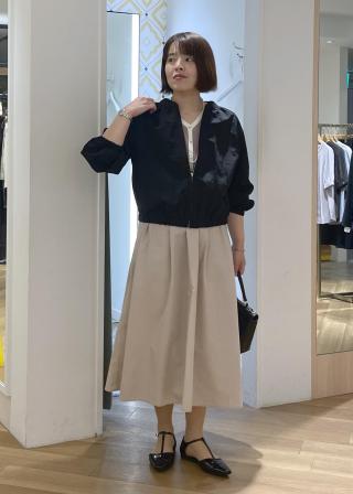 コンパクトに見えるデザインですが、たっぷりとしたギャザーが入っており、着丈も腰にかかるくらいなのでゆとりをもって着用していただけます。ナイロンブルゾン=スポーティーなイメージがありますが、ノーカラーで女性らしく着ていただけます。