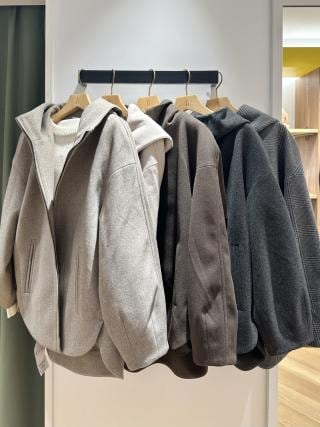 ジャージメルトンのふっくらとした温かみのあるフード付きジップコート。