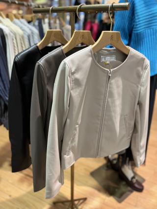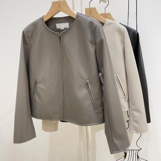 ・合わせやすくシンプルに仕上げた、ノーカラーデザインのフェイクレザーブルゾン。