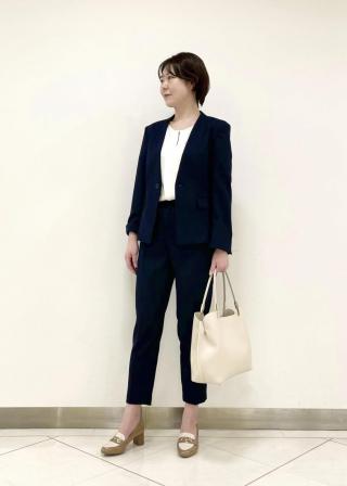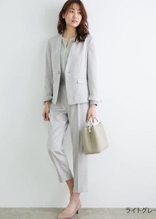 おすすめコーデ:ノーラペルのシンプルな襟元なのでインナーにフリルなどのデザイン性のあるブラウスともバランス良くお召し頂けます。カットワンピースと合わせてカジュアルダウンした着こなしも抜け感が出ます。