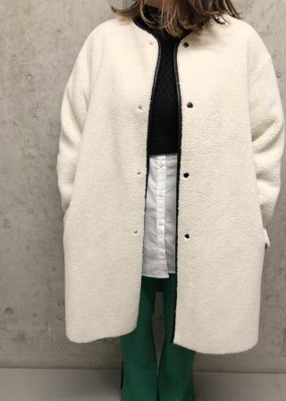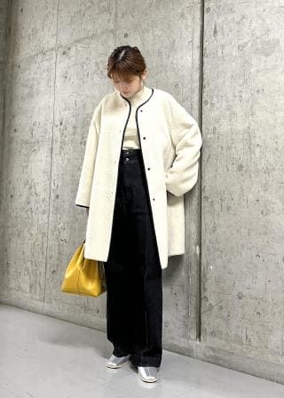 おすすめコーデ:カジュアルになりがちなボアコートですがパイピングでスッキリとキレイめなデザインなので、通勤にも使って頂けます。