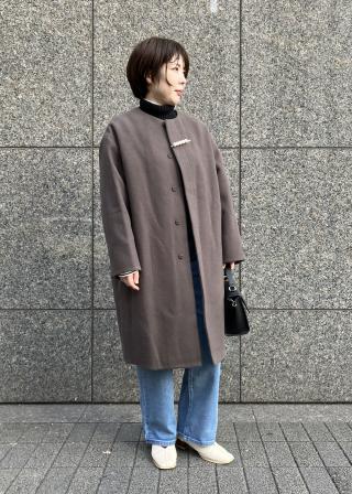 ウール素材のアウターで厚みのある生地ですが、ローングコートにしては軽く羽織ることができます。着丈は膝がしっかり隠れる長さで、肩まわりなどゆったりめのシルエットです。ノーカラーデザインなので、上品に柔らかい印象でお召し頂けます。