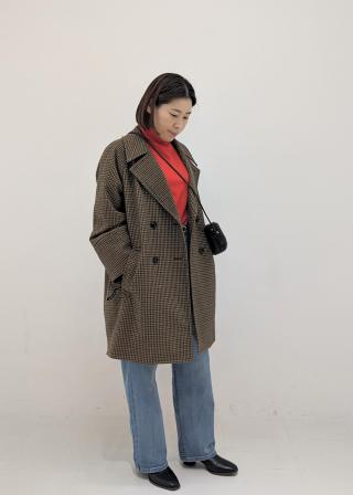 サイズ感:全体的に大きいサイズ感です。肩が落ちるデザインで肩幅など気にせず着れます。丈はミディ丈で低身長の方にも合わせやすいです。