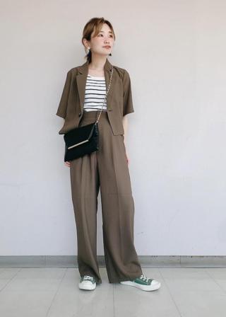 ショート丈でトレンド感があり、セットアップのパンツ以外でもロングスカートやデニムとコーディネートできて着回し力バツグンです!裏地がなくとても薄くて軽い素材なのでキャミソールやタンクトップの上からサッと羽織れば、肌見せを抑えつつも涼しく着られます!