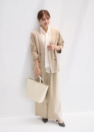 ノーカラーのジャケットなので首周りがスッキリ見えます。オーバーサイズのシルエットなので、カッチリしすぎず、リラックスした印象で着ていただけます。
