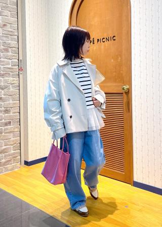 ・本格派のトレンチコートのデザインをそのままに、着丈を短くして、前後差ヘムでフィニッシュ。