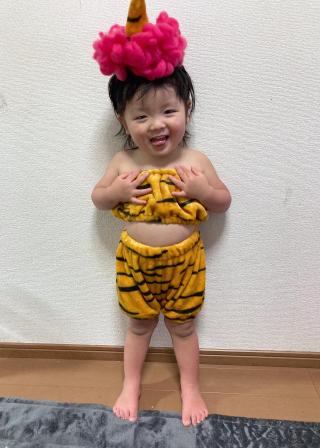・鬼の角付ヘアと、虎柄のベアトップ、パンツの3点セット。