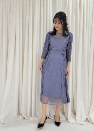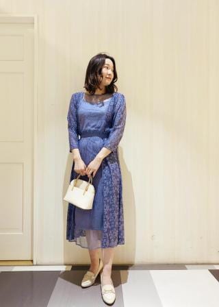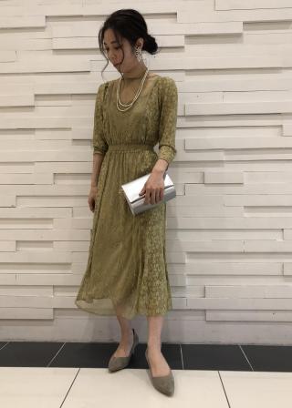 おすすめコーデ:レースの透け感が素敵なので一枚で着るのがおすすめですが、丈の短いニットやカーディガンなど重ね着すると、お召し頂けるシーンが増えると思います。披露宴帰りのカフェやレストランでお食事など…!小物はベージュ、キャメル、アイボリーなどがドレスの色を引き立ててくれるのでおすすめです!