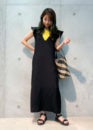 サイズ感:身幅はボディラインを拾わずゆとりがあります。着丈は160cmの私が着用してふくらはぎが隠れて足首が見えるくらい。袖はノースリーブですが、肩に少しフリルがあります。襟ぐりは前後共に深めにVラインで開いています。