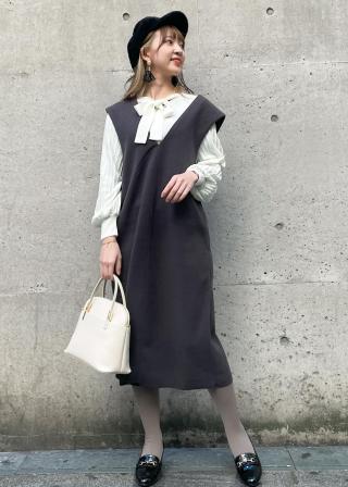 おすすめコーデ:首周りがVネックになっているため、インナーはスタンドネックやタートルネックトップスと相性が良いです。ボウタイリボンなどデザイン性があるものも◎