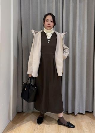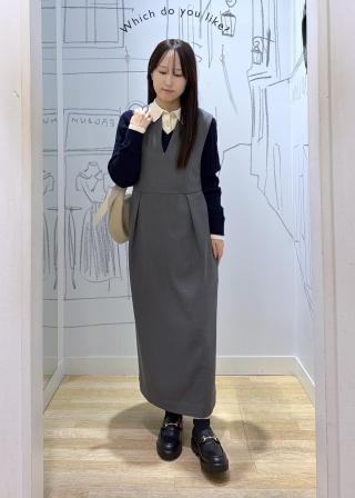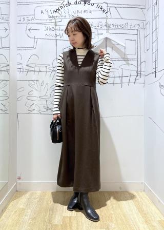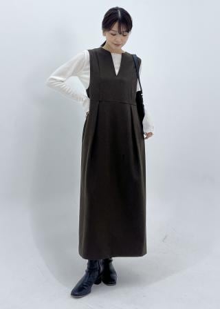 ・顔周りがすっきりした印象にみせるキーネックカラーのジャンパースカート。