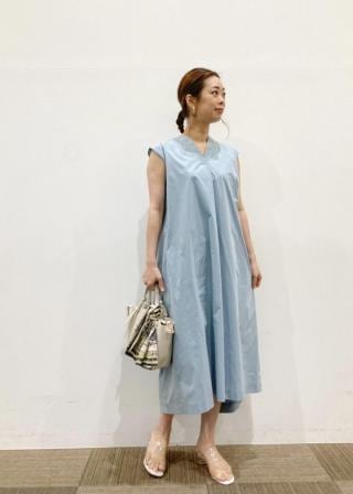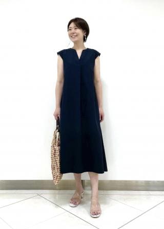・長めの着丈で大人らしく決まる、スキッパーネックのノースリーブワンピース。