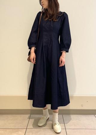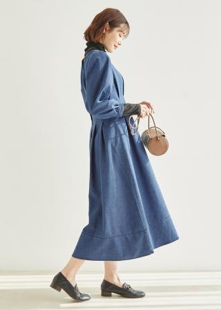 ・ウエストタックでメリハリを出した、クラシカルなシルエットのデニムワンピース。