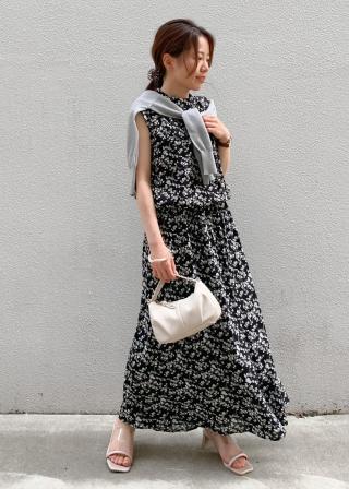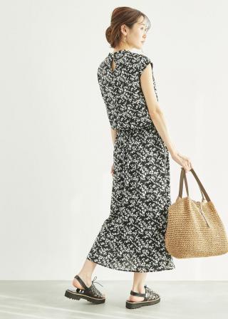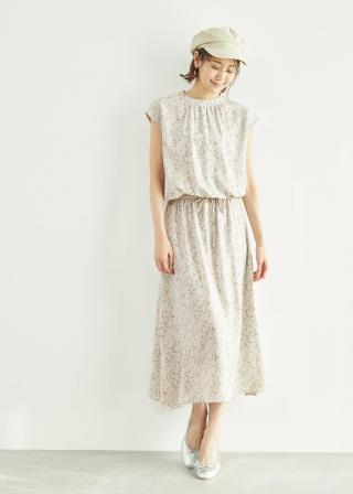 ・シックな表情で取り入れやすい、落ち着いた色合いをベースにした小花プリントワンピース。
