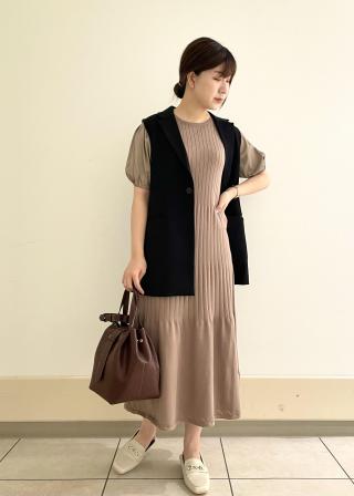 おすすめコーデ:1枚で着映えするワンピースですが、肌寒い季節になった時はきれいめだとノーカラーデザイン、カジュアルダウンだとマウンテンパーカーとショート丈アウターを羽織って頂くと低身長の方でもバランス良く着て頂けます。