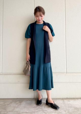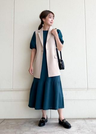 おすすめコーデ:1枚で着映えするワンピースですが、肌寒い季節になった時はきれいめだとノーカラーデザイン、カジュアルダウンだとマウンテンパーカーとショート丈アウターを羽織って頂くと低身長の方でもバランス良く着て頂けます。